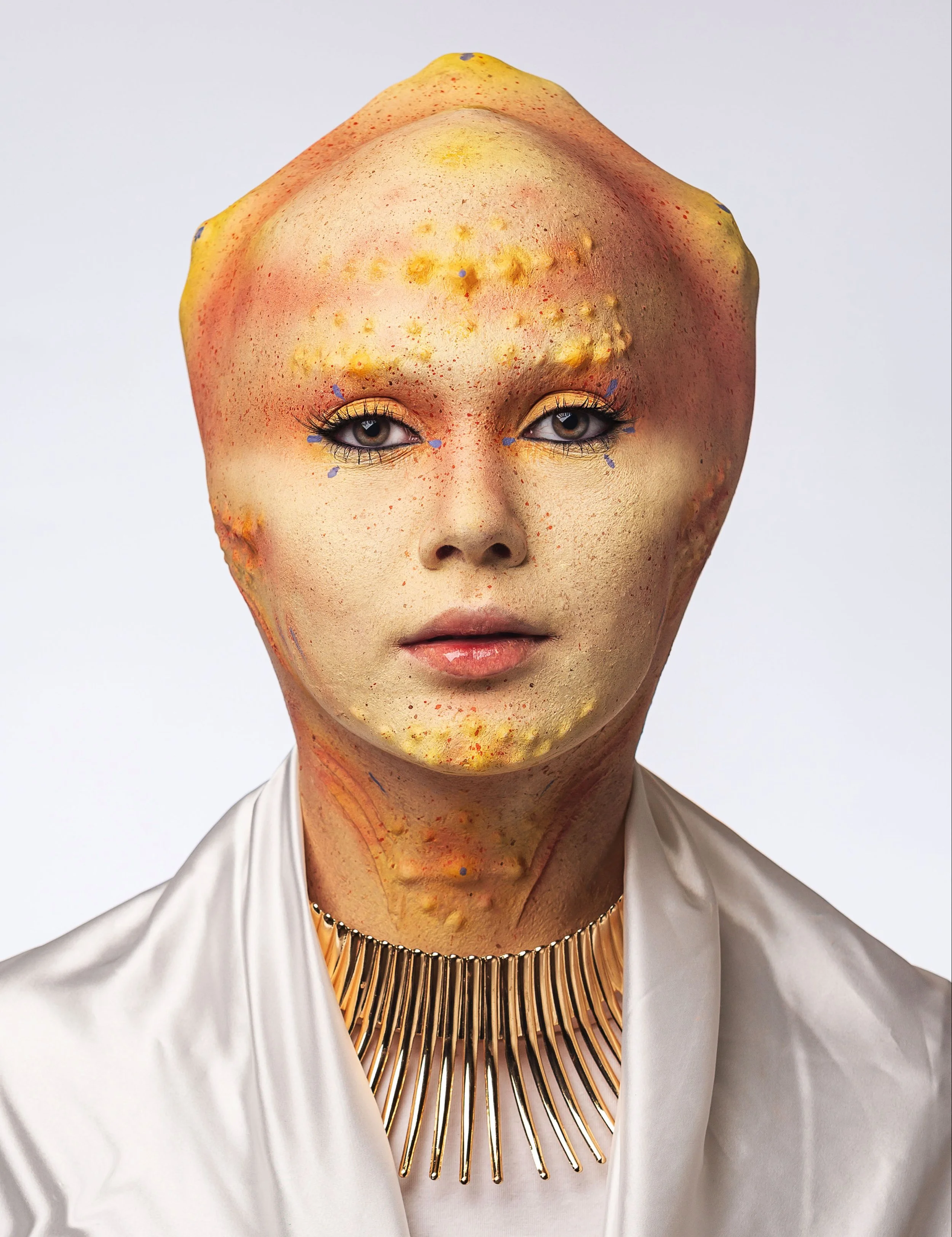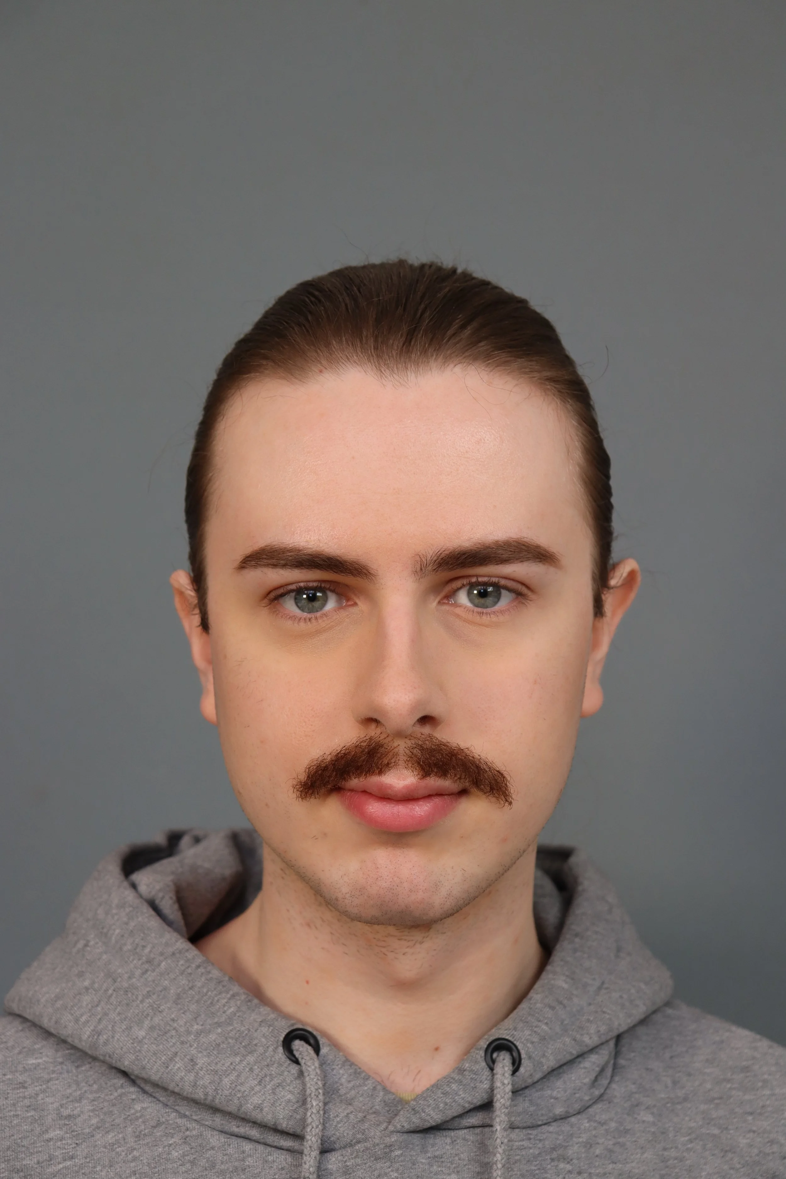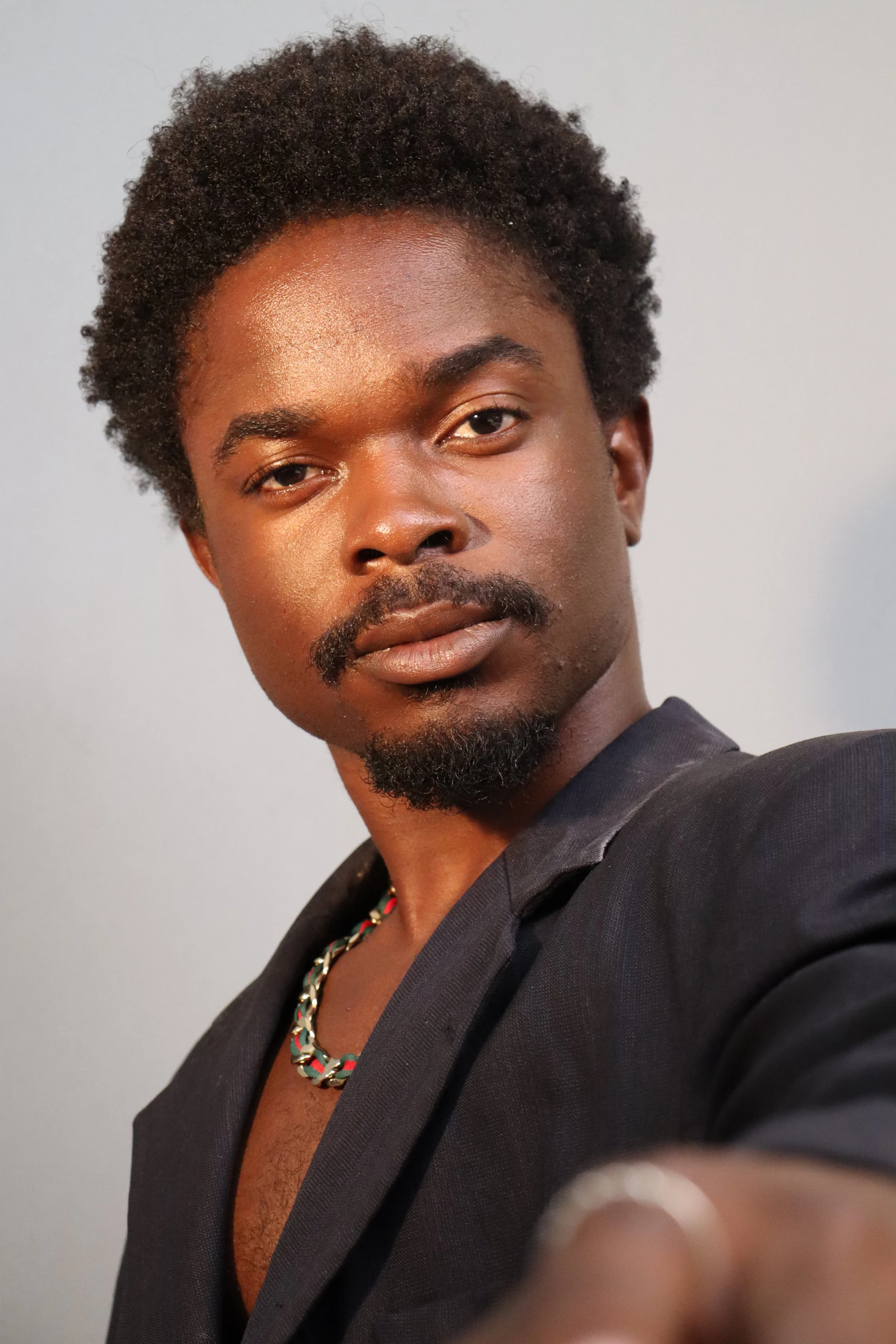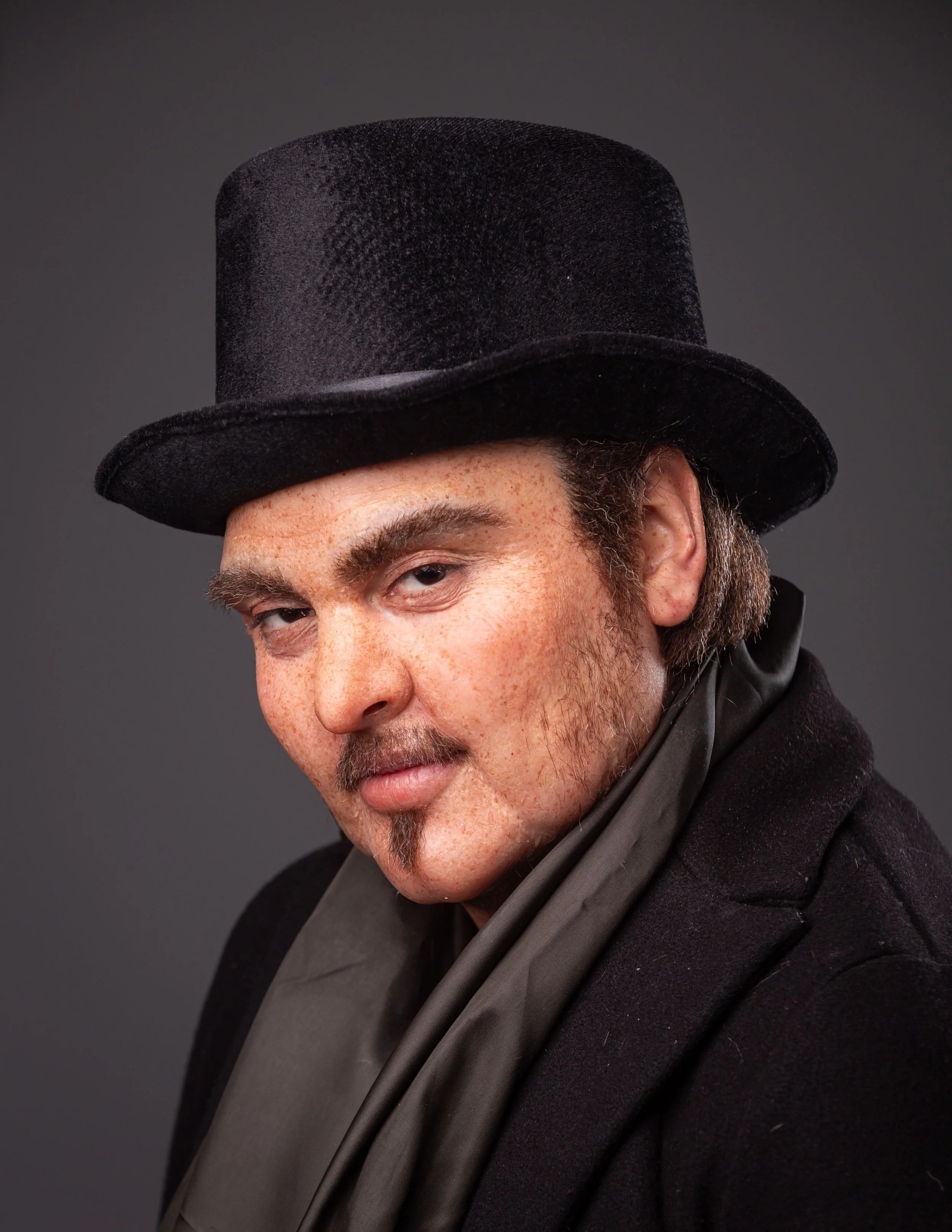 A film director holds a clapperboard, with a blurred background of people, including a woman with blonde hair and a man, at a film set or studio.