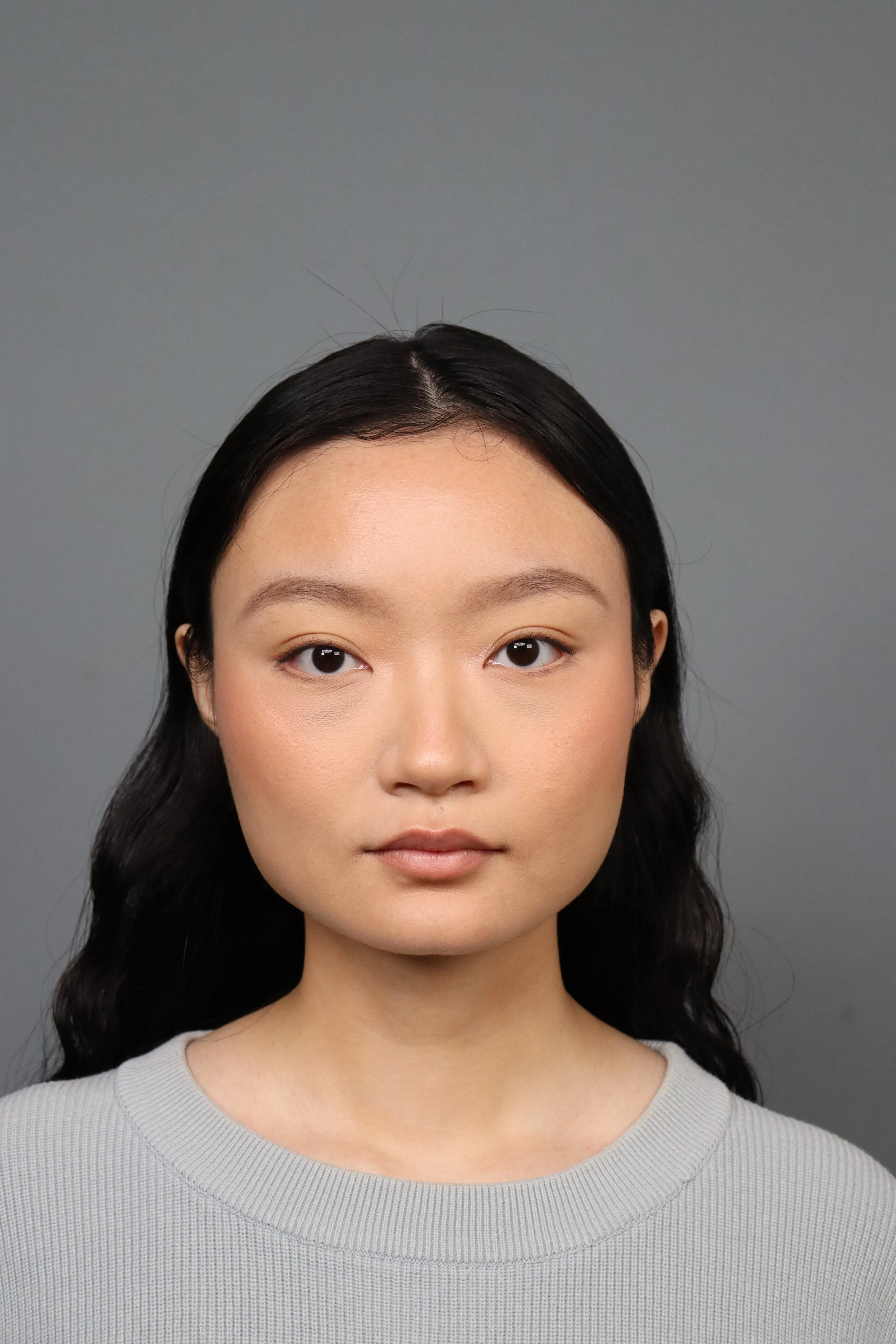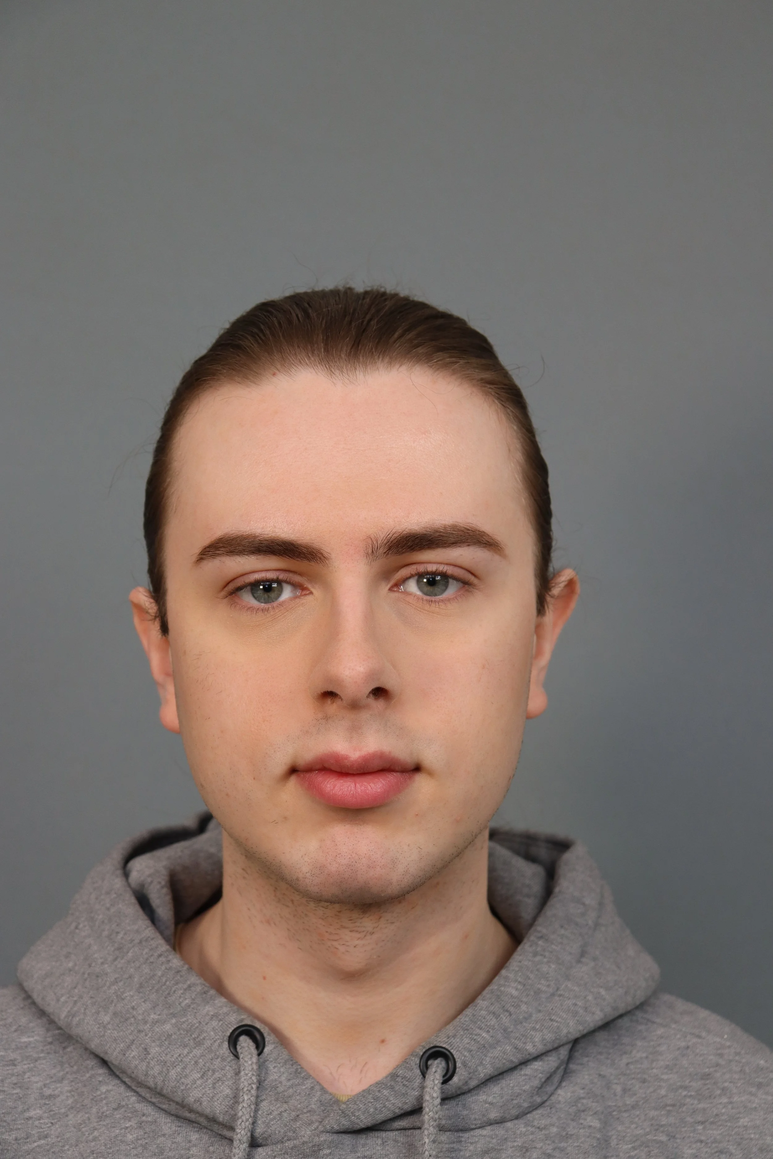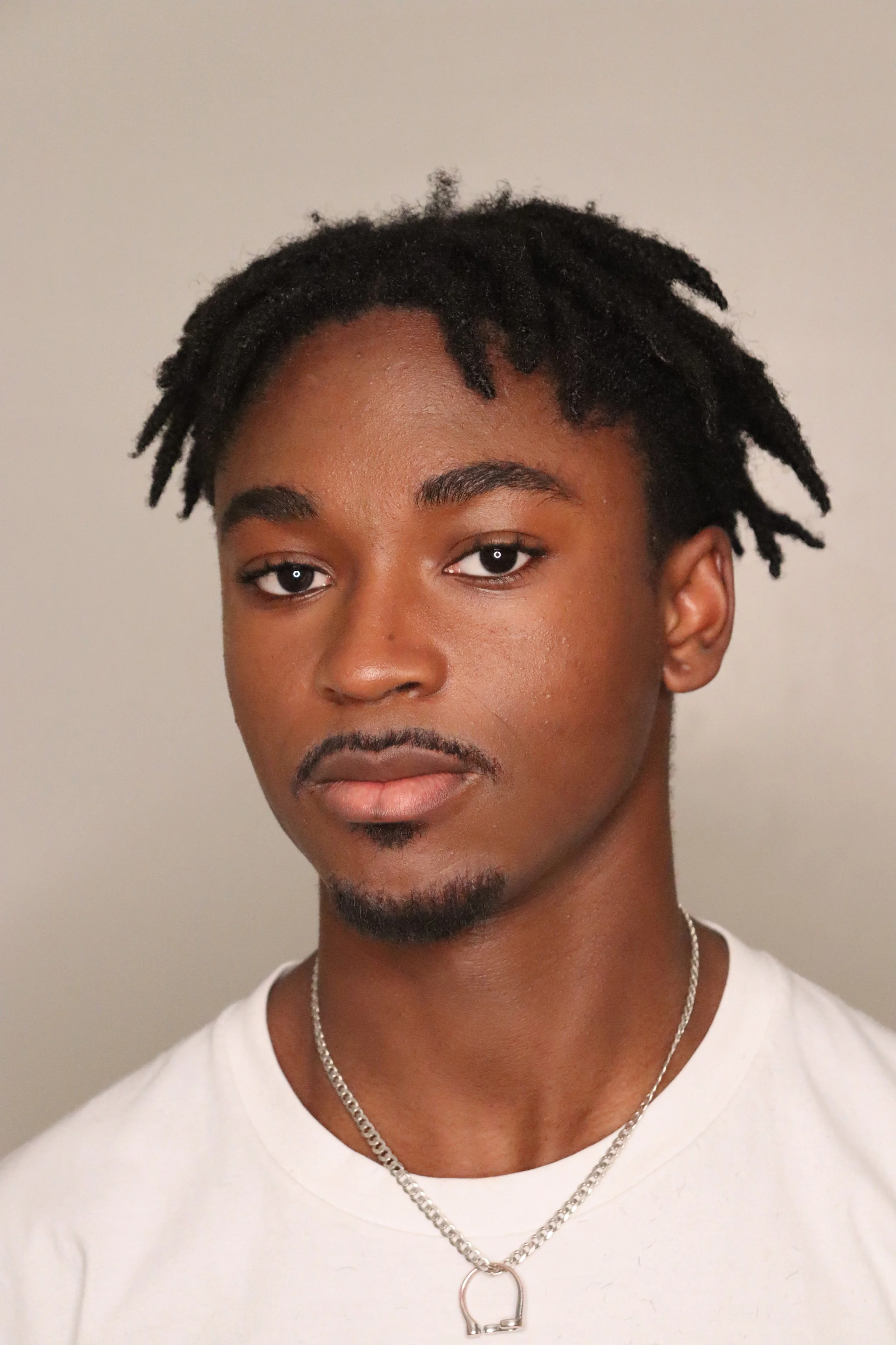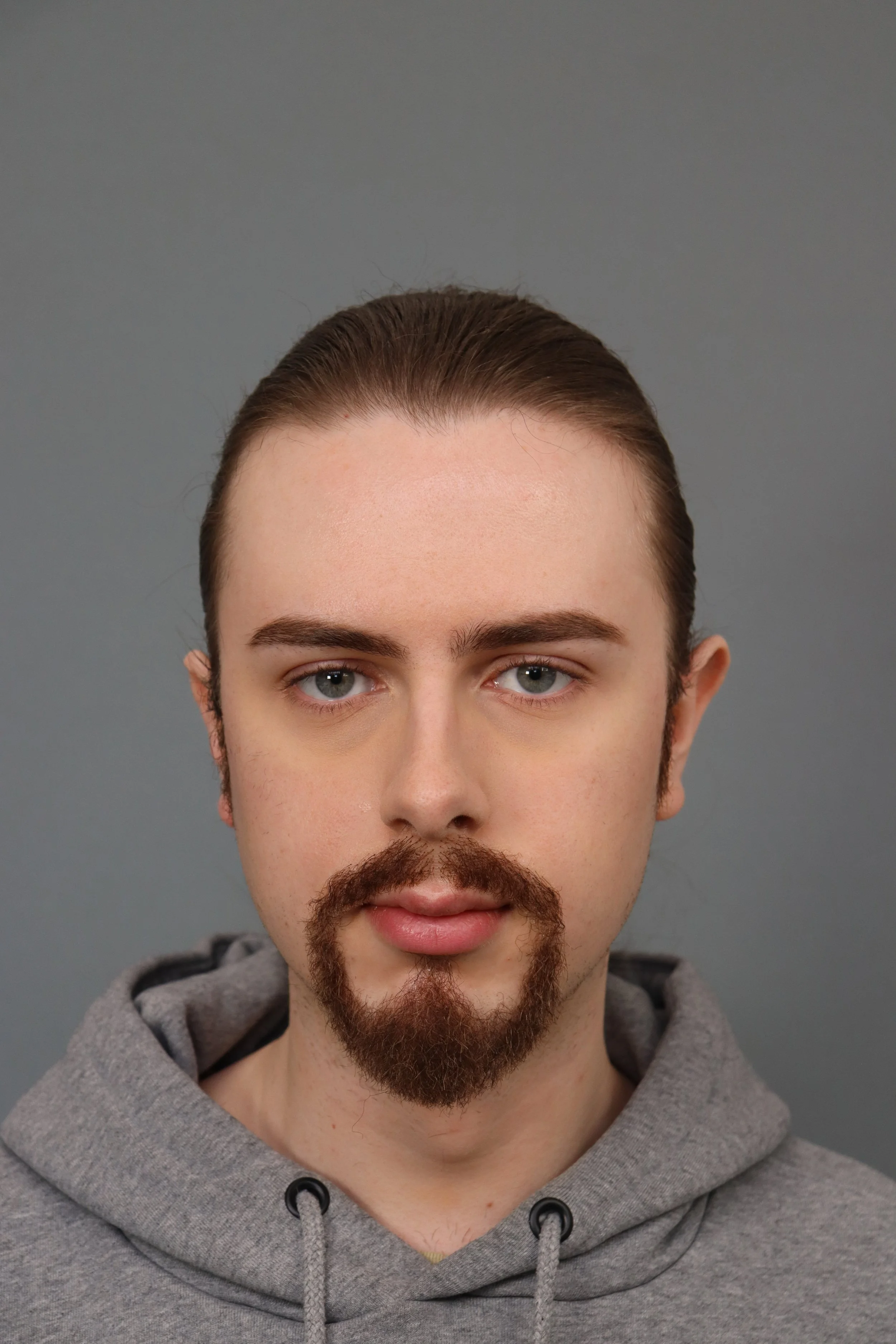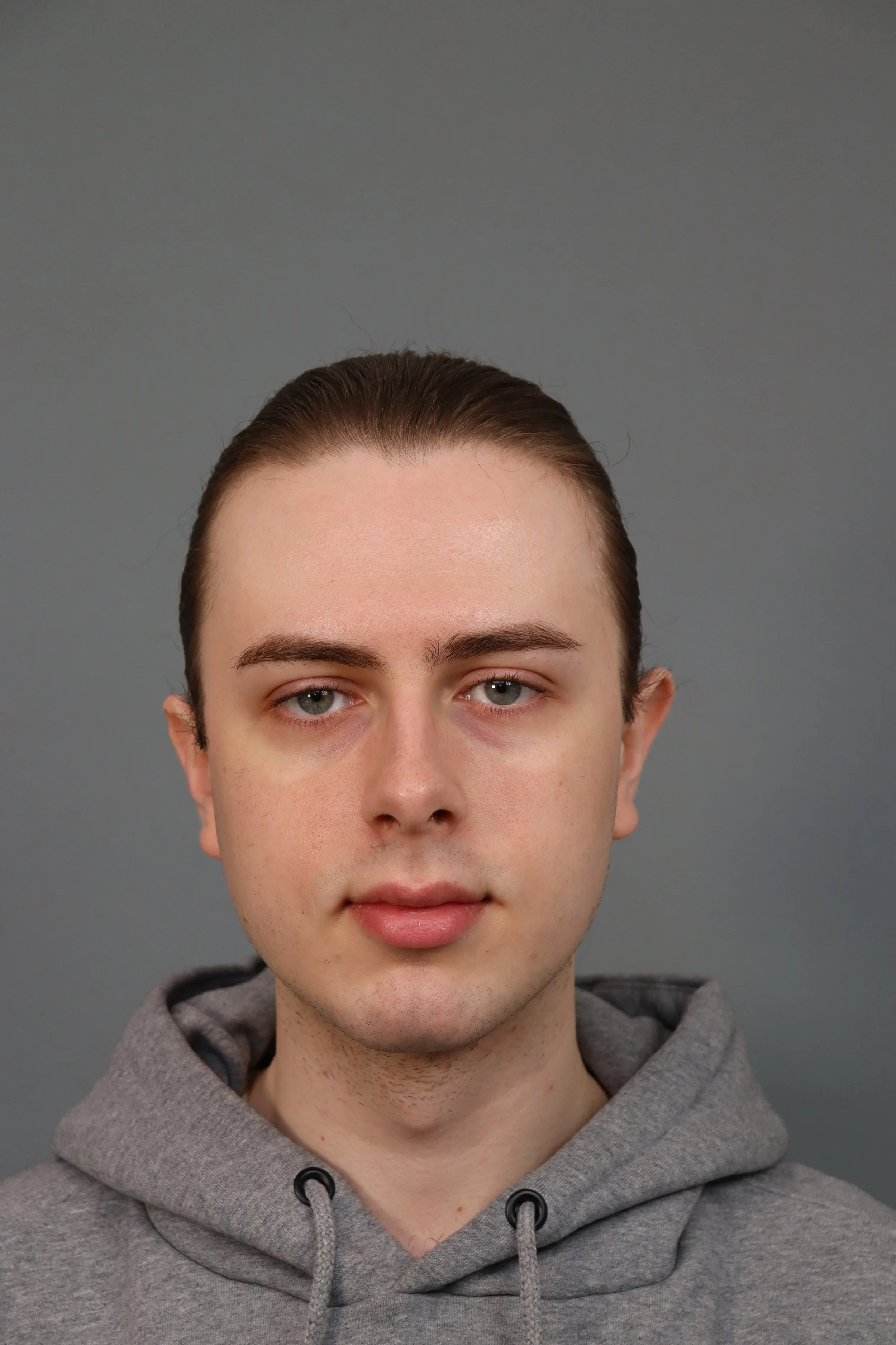 A film director holds a clapperboard, with a blurred background of people, including a woman with blonde hair and a man, at a film set or studio.